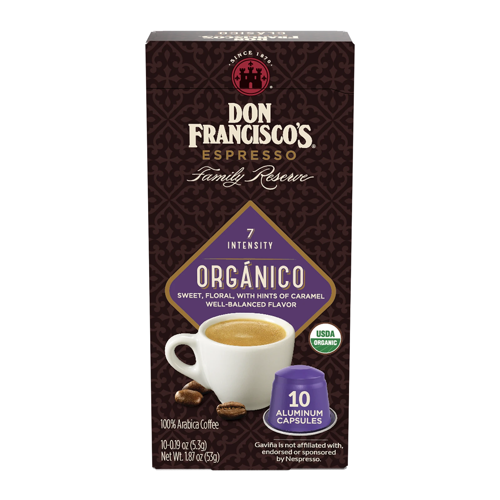 Product image 4Don Francisco's Aluminum Espresso Capsule. Compatible with Nespresso Original Line Espresso Machines. Gaviña is not affiliated with, endorsed or sponsored by Nespresso. Recyclable through TerraCycle.